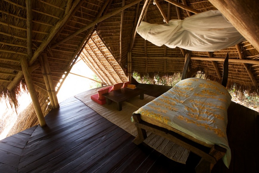 Each chalet is cleverly built on wooden decks with palm thatch roofs and other local materials adjoining the main bedroom with the adjacent shower and loo. The sides and windows are open to the elements, allowing for the fresh air from the lake for coolness. The beds have mosquito nets which are lowered around them in the evenings. Lighting is solar powered.