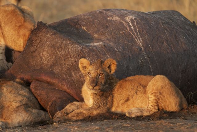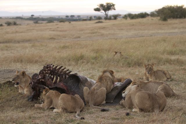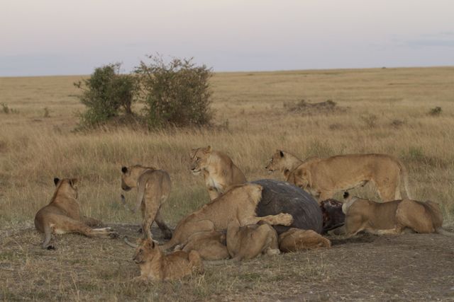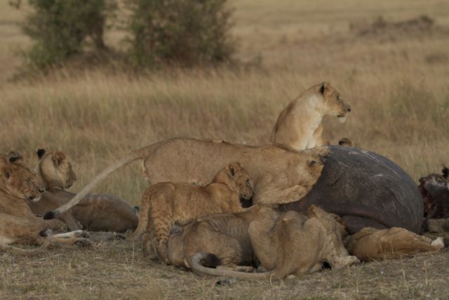 On a recent safari to the Masai Mara (Kenya), we arrived the day after Notch and his boys had killed an adult hippo. The first two days the pride was still struggling to get through the thick skin of the hippo. Although they were slowly eating their way in, they were thin and hungry. It was almost three days before they had managed to really open up the carcass and get to the meat. By the end of the third day, these lions had full bellies, and all that remained of the carcass was the bare skull, spinal column, rib cage and the skin, stretched out like a picnic blanket.