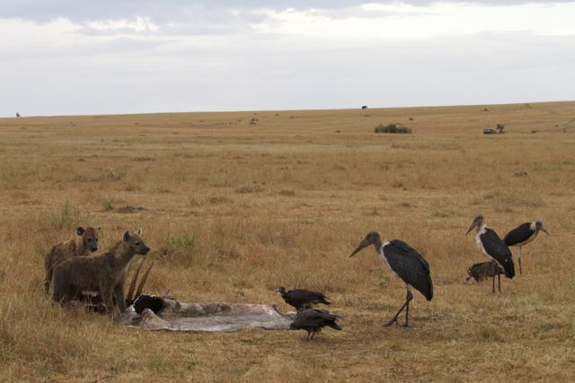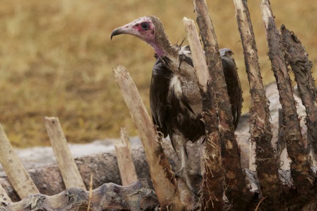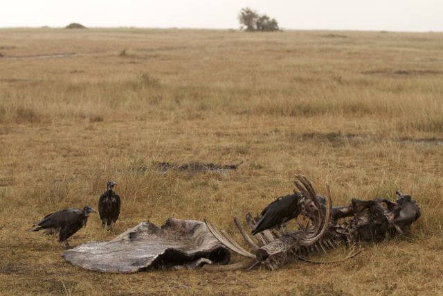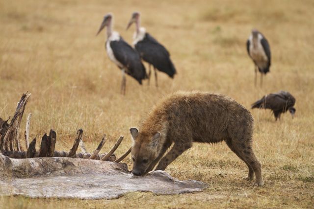 After the lions had reduced the carcass to the bare minimum, the scraps on the bones were gleaned by vultures. Hyaenas, who had been patiently waiting for a chance to get involved, came in and started working on the smaller bones like the ribs, and eating the skin while it was still soft.