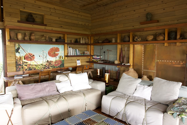 The suites are built in a spacious contemporary style with a thatched roof, and include a main bedroom, sala and an en suite bathroom. There is both an indoor and outdoor shower, and each suite has its own plunge pool and reading area overlooking the floodplains.