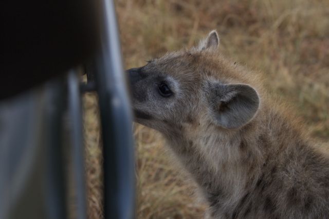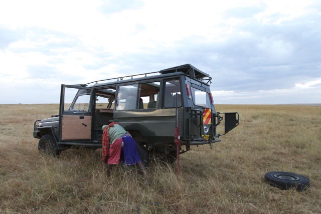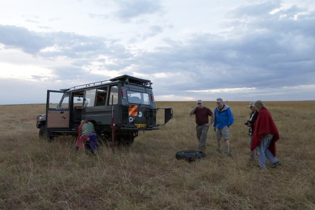 As I started rolling forward I realized that I had a flat tyre.  When I indicated my disbelief to Risa, our Masai spotter (a local expert), he started laughing … and he told me that he had seen some of the young hyenas come up to the back of the vehicle and start chewing the tyres.